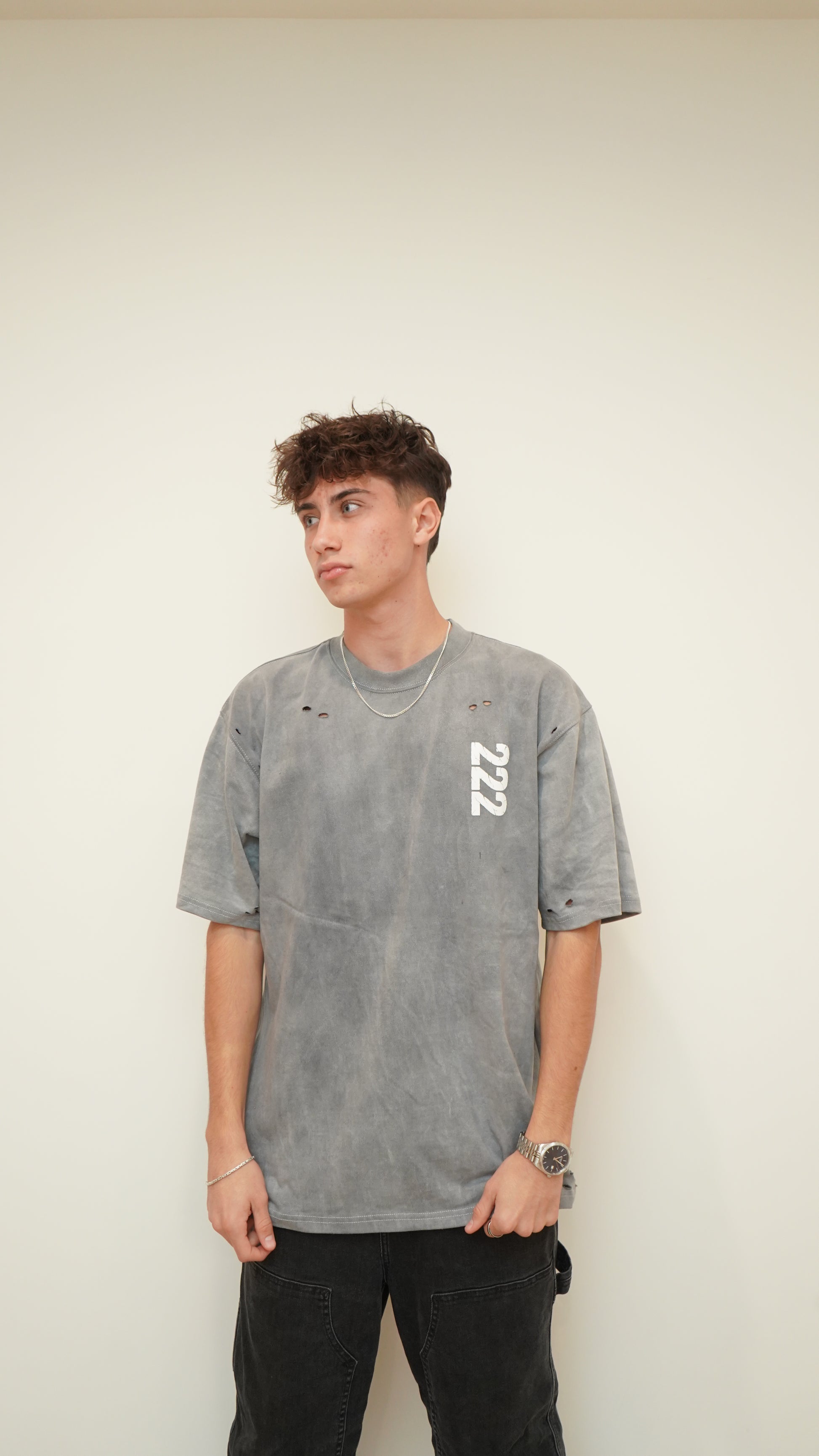 The REIKO Oversized Tee is crafted from premium heavyweight cotton for a structured yet comfortable feel. Designed with a relaxed fit, raw distressed details, and bold REIKO graphics at the back, this piece combines effortless streetwear with a luxury edge. A signature garment that embodies individuality, confidence, and the spirit of 222.